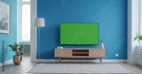 modern living room with tv and green screen, luxury forniture and light from the windows, stylish internal design for interiors