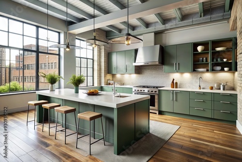 Modern loft apartment's sleek open kitchen features glossy gray-green cabinetry, a crisp white island with smooth surface, and chic industrial-chic architectural details.