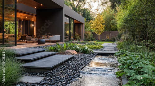 Modern luxury home exterior with landscaped garden featuring a stream and stepping stones
