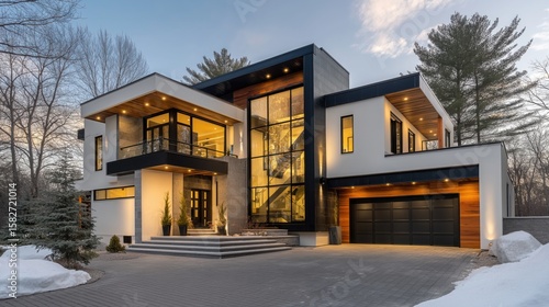 Modern luxury home with dramatic glass facade and wood accents in winter