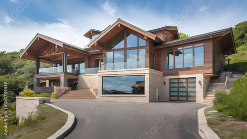 Modern luxury home with large glass windows, wooden accents, and a stylish exterior. Surrounded by greenery, this elegant house features a spacious driveway and panoramic views.