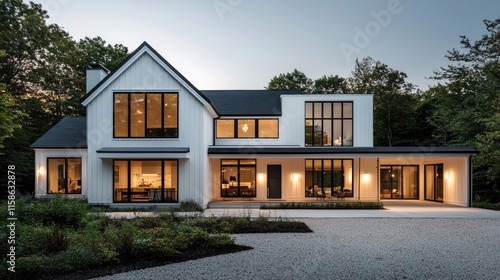 Modern Luxury Home with Large Windows and Elegant Design Surrounded by Lush Greenery in a Serene Residential Neighborhood at Dusk