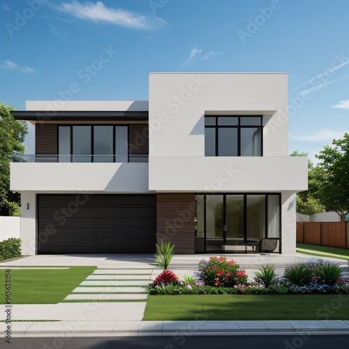 Modern luxury house with a well-manicured lawn..