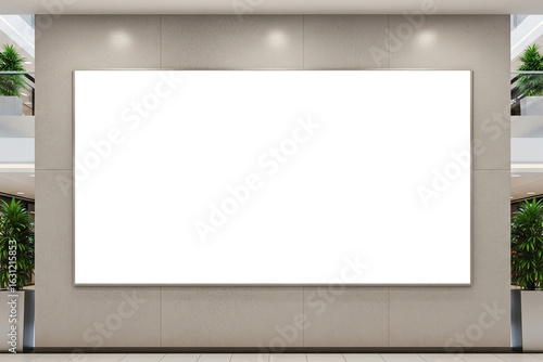 Modern Mall Interior with Large Blank Billboard, Neutral Tones and Greenery