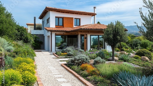 Modern Mediterranean-Style Villa with Lush Garden and Scenic Mountain Views