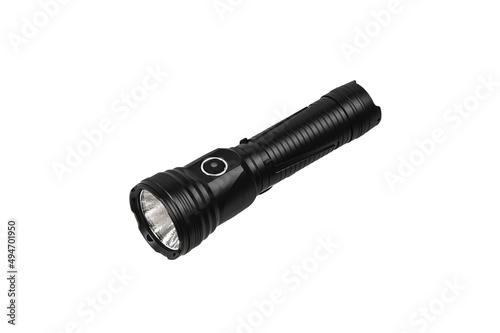 Modern metal LED flashlight in black color. Portable flashlight isolate on a white back