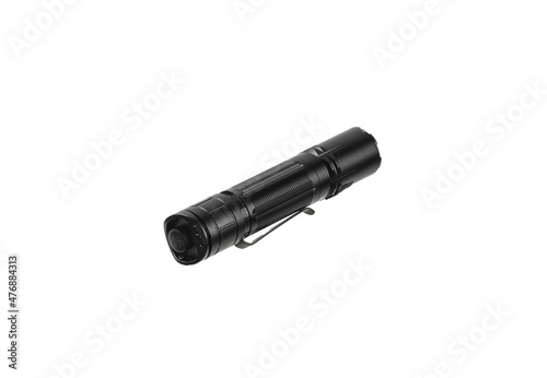 Modern metal LED flashlight. Portable lighting device. Isolate on a white back