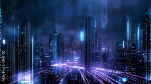 Modern Metropolitan Skyline at Night with Digital Networks