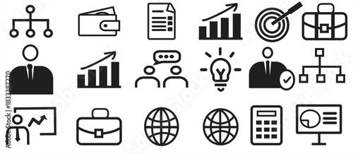 Modern Minimalist Business Icons Set – Line Art Collection Featuring Charts, Workflow, Finance, Global Network, Analytics, Target, Calendar, Lightbulb & Office Elements