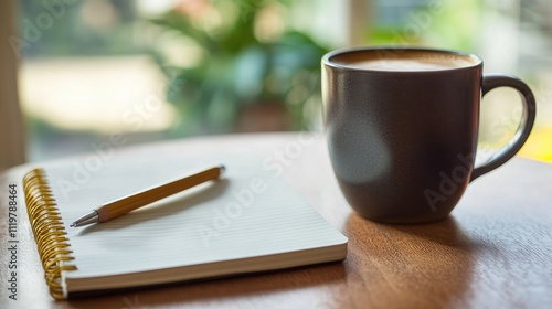 Modern minimalist desk with a sleek coffee mug, clean notebook, pencil, and pen, highlighting simplicity and productivity