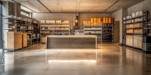 Modern minimalist interior of a well-organized storage space with shelves and packing area