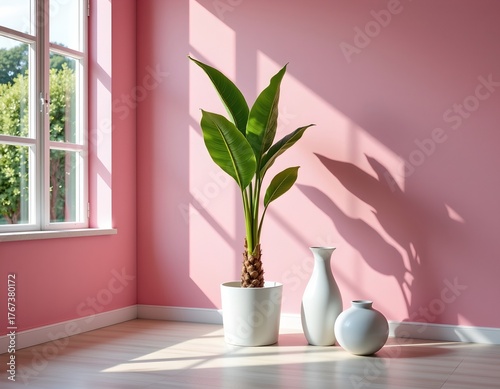 Modern Minimalist Interior with Sunlit Palm and Vase