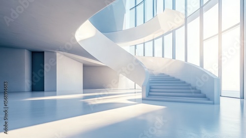 Modern, minimalist interior with sweeping staircase and large windows