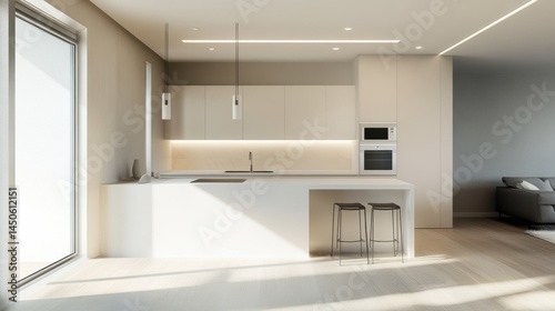 Modern, minimalist kitchen interior design, featuring light beige tones.