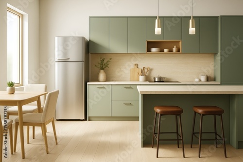 Modern minimalist kitchen interior with green cabinets, wooden furniture, and natural light in a clean, contemporary indoor setting.
