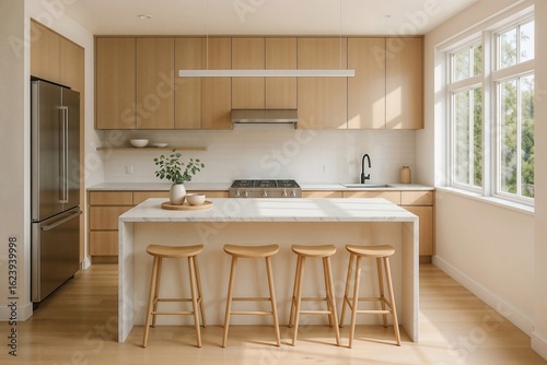 Modern Minimalist Kitchen Island with Marble Countertop and Light Wood Stools