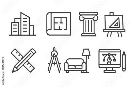 Modern minimalist line icons of architecture and interior design, blueprint, building, column, drafting, floor plan, construction tools, furniture, digital art, transparent vector set