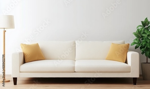 Modern Minimalist Living Room Featuring a Cozy Cream Sofa with Yellow Cushions, Floor Lamp, and Indoor Plant Against a Light Wall Background