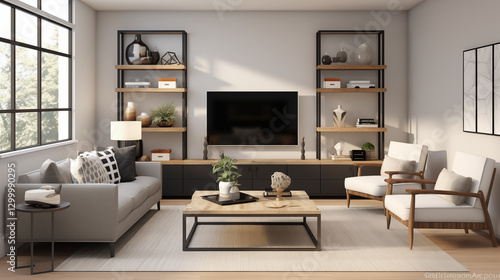 Modern minimalist living room featuring a wooden bookcase, white sofa, and beige tones, enhanced by natural light and soft textures for a calm atmosphere.