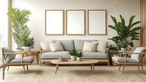 Modern minimalist living room interior design with light grey sofa, wooden furniture, plants, and three blank frames on the wall.