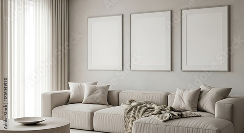 Modern minimalist living room interior with cozy modular sofa, elegant round coffee table, sheer curtains, and three blank picture frames on a light wall background