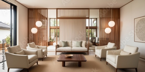 Modern minimalist living room, warm beige tones, vertical wood slat wall, sleek furniture, round pendant lights, large windows, natural light, coffee table, armchairs, cozy atmosphere, contemporary de
