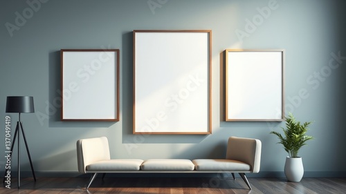 Modern Minimalist Living Room with Empty Picture Frames and Stylish Sofa