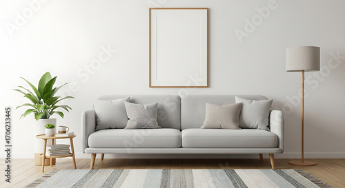Modern Minimalist Living Room with Light Gray Sofa, Abstract Wall Art, Green Plant, Wooden Coffee Table, and Natural Lighting, 4K image