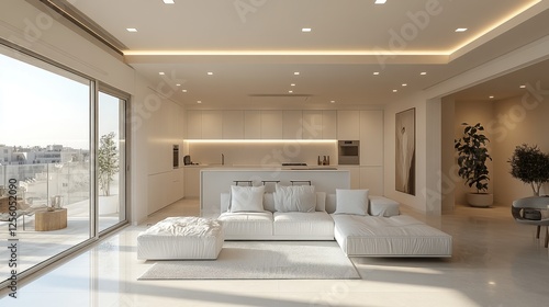 Modern minimalist living room with white furniture, large windows, and a serene outdoor view