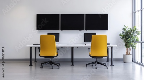 Modern Minimalist Office Workspace with Yellow Ergonomic Chairs