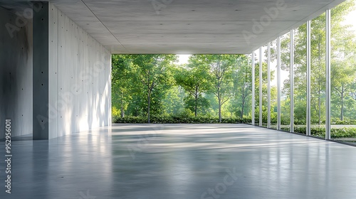 Modern Minimalist Room with Large Windows Overlooking Lush Greenery