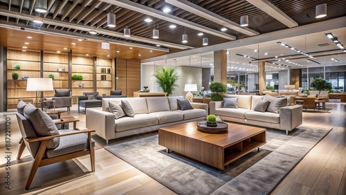 Modern minimalist showroom interior with sleek furniture displays and stylish home decor items under bright ambient lighting.
