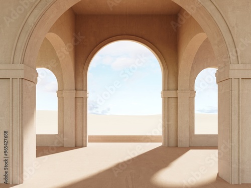 Modern minimalistic interior with a view of the sand dunes - 3d render. Simple background with a podium, showcase for advertising and presentations. Aesthetic architecture of the building space.