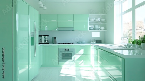 Modern Mint Green Kitchen Design With Bright Sunlight