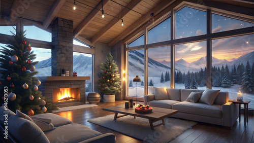 Modern Mountain Cabin with Fireplace, Panoramic Winter View, and Christmas Tree
