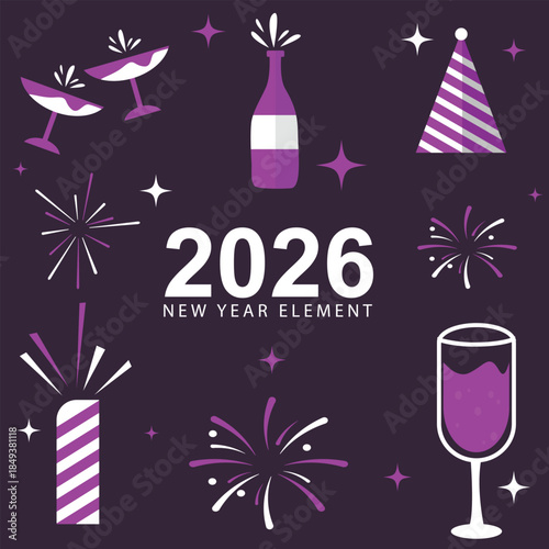Modern New Year 2026 elements on a dark background featuring purple champagne, party hats, and white stars, creating a sophisticated and festive celebratory atmosphere.