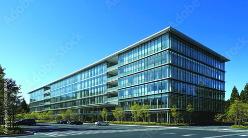 Modern office building facade, sunny day, parking lot, trees in background. Possible use Commercial real estate