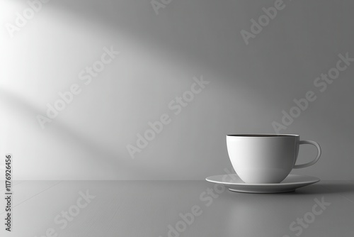 Modern Office Desk with a Black Coffee Cup in Neutral Lighting Against a Blank Wall, Ideal for Text Placement and Professional Use