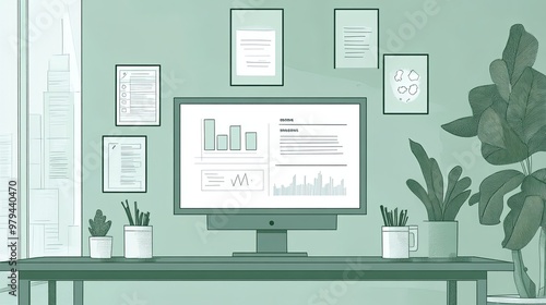 Modern office environment showcasing SEO tactics sketch with a digital screen illustrating search ranking improvements. Clean and minimalistic design