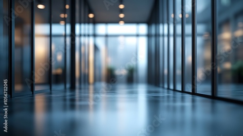 Modern Office Hallway with Glass Walls and Ambient Lighting Creating a Professional Atmosphere : Generative AI