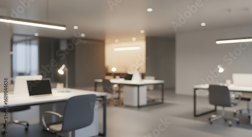 Modern office interior bathed in warm, inviting light showcasing sleek workstations and ergonomic chairs, perfect for productive collaboration and focused work.