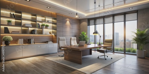 Modern Office Interior Design with Wooden Desk, City View, and Bookshelves, interior design, office space, modern office, office interior