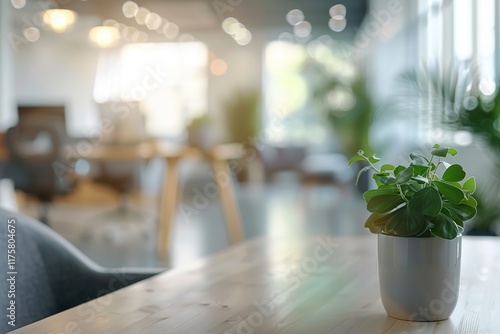 Modern office plant on wooden desk, blurred background.