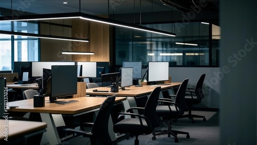 Modern office with open layout, ergonomic chairs, and wooden desks, showcasing a focus on comfort and productivity.