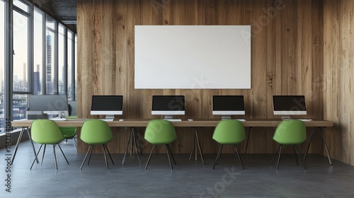 Modern office with wood wall, computers, green chairs, and blank poster.