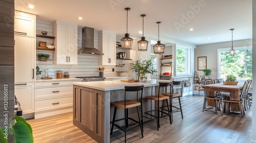 Modern open concept kitchen with wood accents and stylish pendant lighting