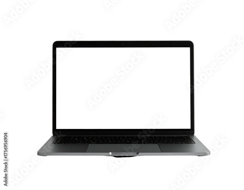Modern, open portable computer, blank screen, dark background, isolated, front view, minimal design