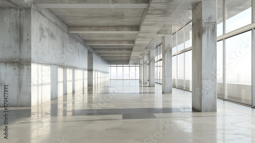 Modern open space panoramic interior with empty wall mock up, daylight and windows. Generated image.