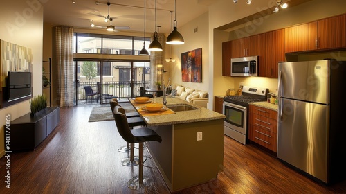 Modern open-concept apartment kitchen and living area.