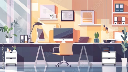 Modern Open-Plan Office Flat Design Illustration with Creative Workspace Concept